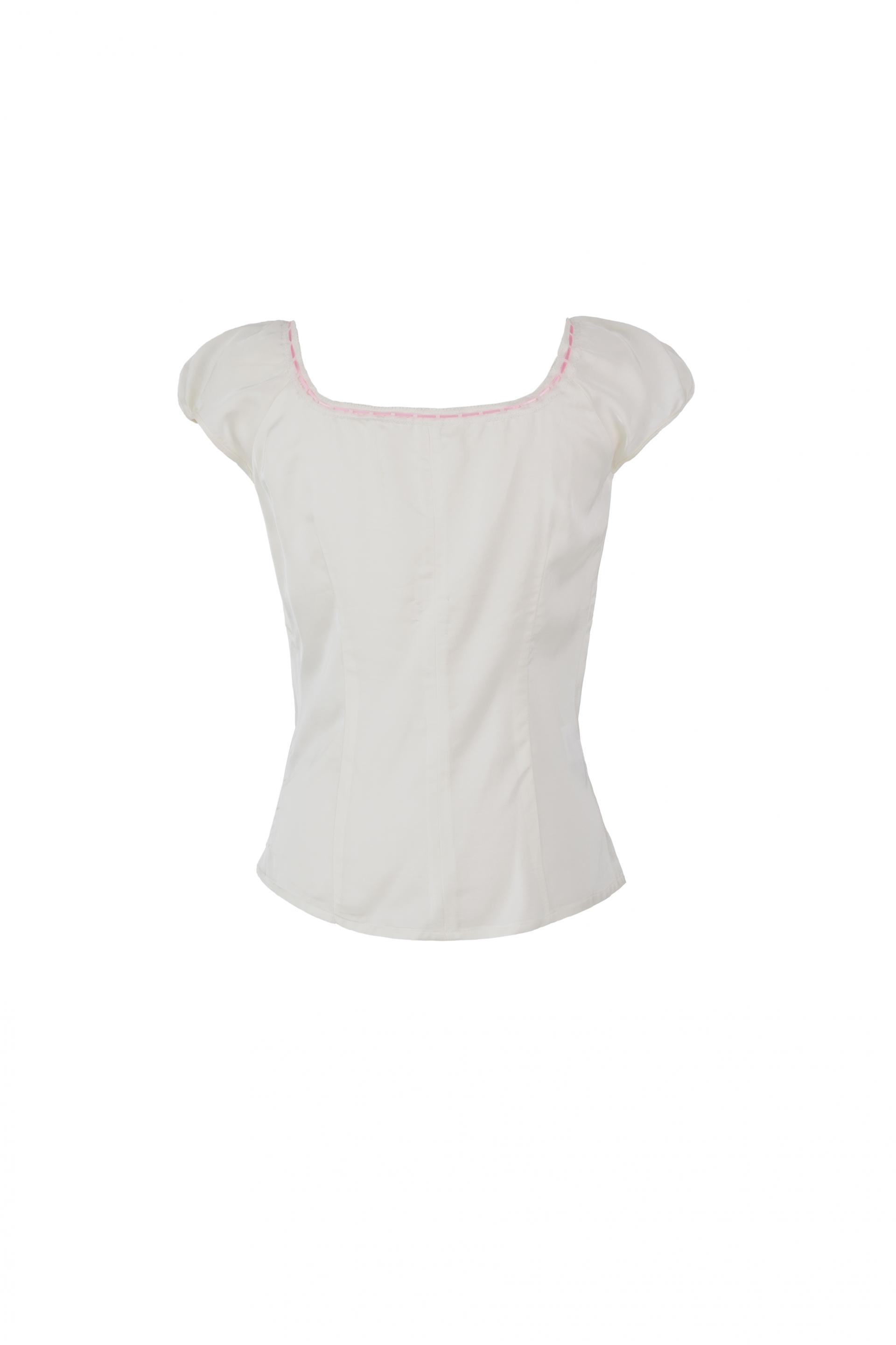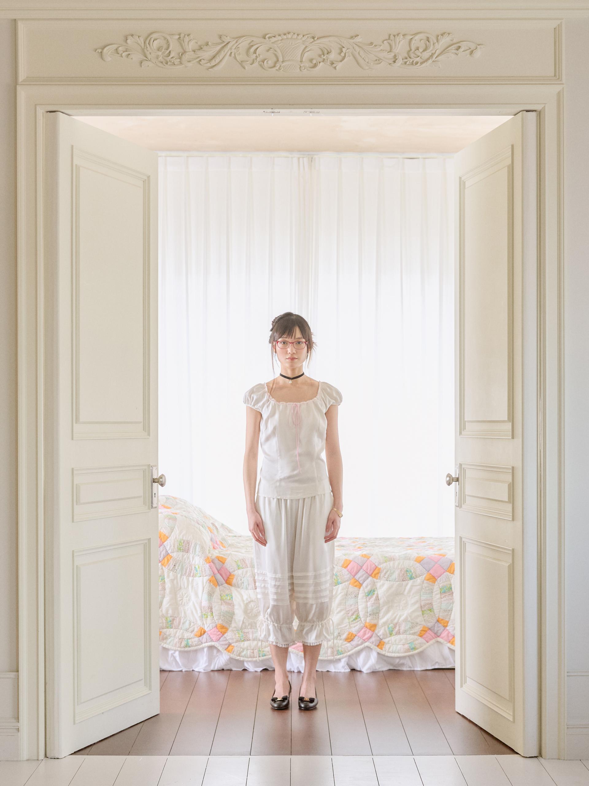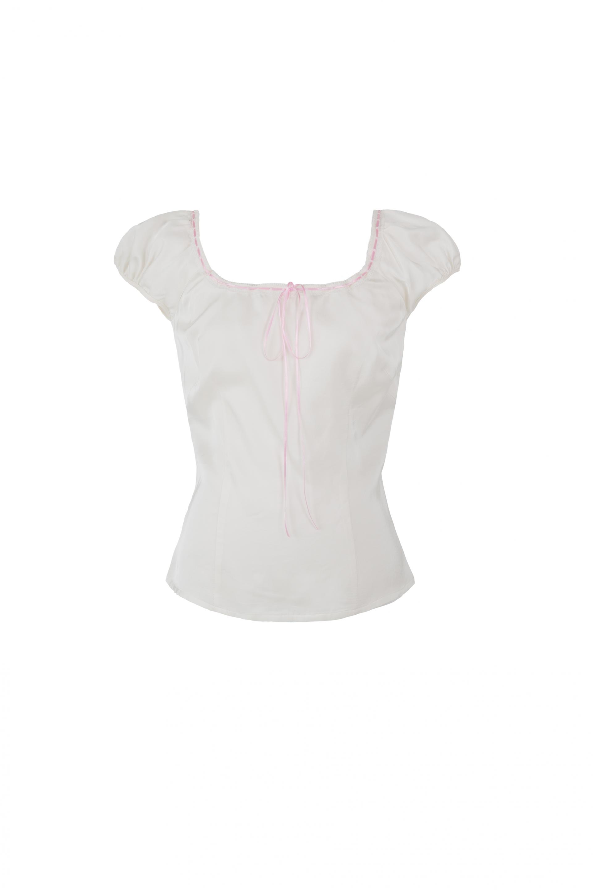 귀여운 퍼프 슬리브, 네크라인을 따라 둘러진 레이스 리본이 참 사랑스러운 탑이에요. 은은한 광택과 부드러운 텍스쳐가 감도는 새틴 소재감까지 더해져서 여자라면 누구나 입고 싶어할 제품입니다.