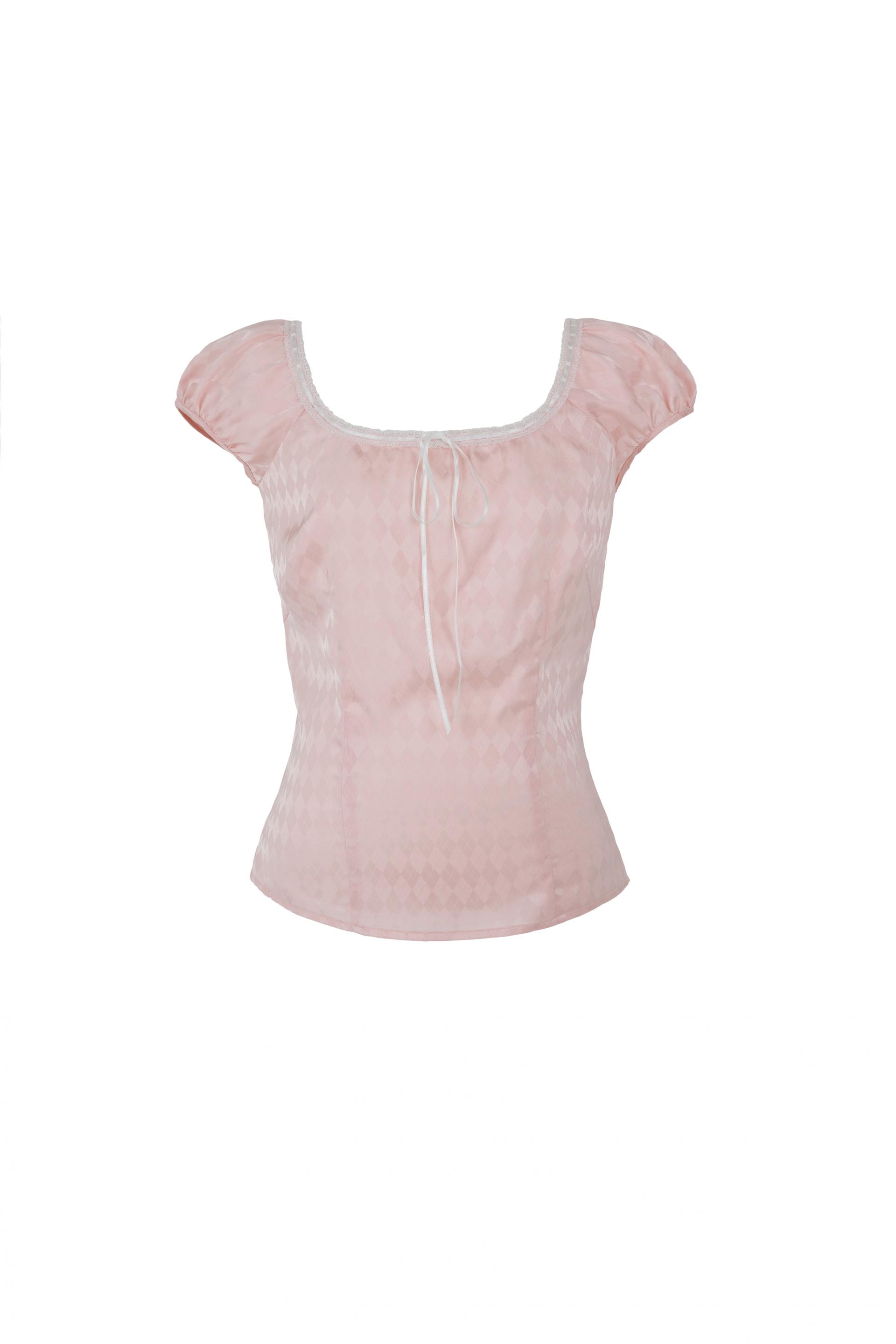 귀여운 퍼프 슬리브, 네크라인을 따라 둘러진 레이스 리본이 참 사랑스러운 탑이에요. 은은한 광택과 부드러운 텍스쳐가 감도는 새틴 소재감까지 더해져서 여자라면 누구나 입고 싶어할 제품입니다.