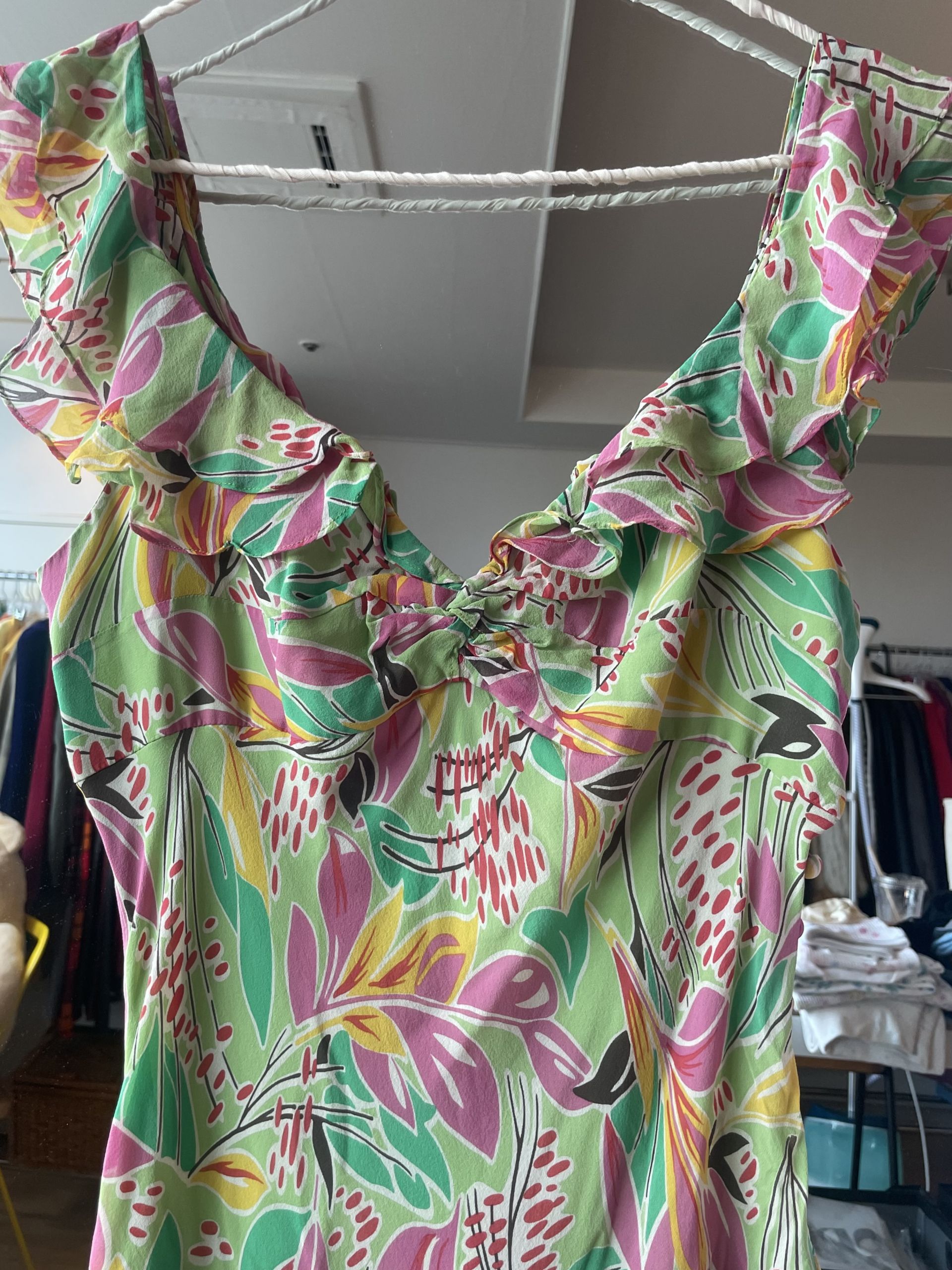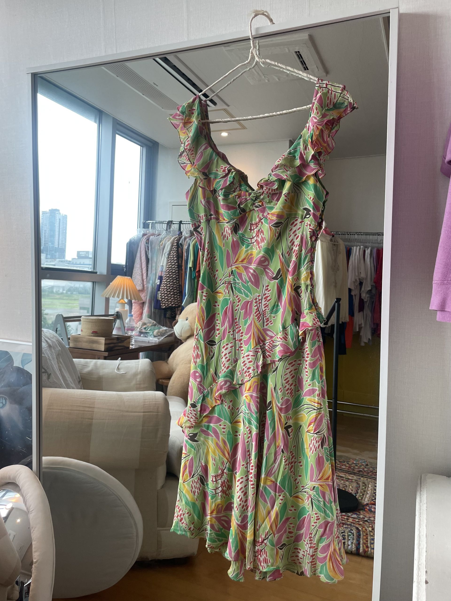 Y2K 시대를 대표하는 브랜드 BCBG의 쉬폰 드레스입니다, 이국적인 느낌의 플로럴 패턴이 인상적이며, 네크라인과 바디 전체에 흐르는 듯한 러플 장식이 너무 예쁜 제품입니다,