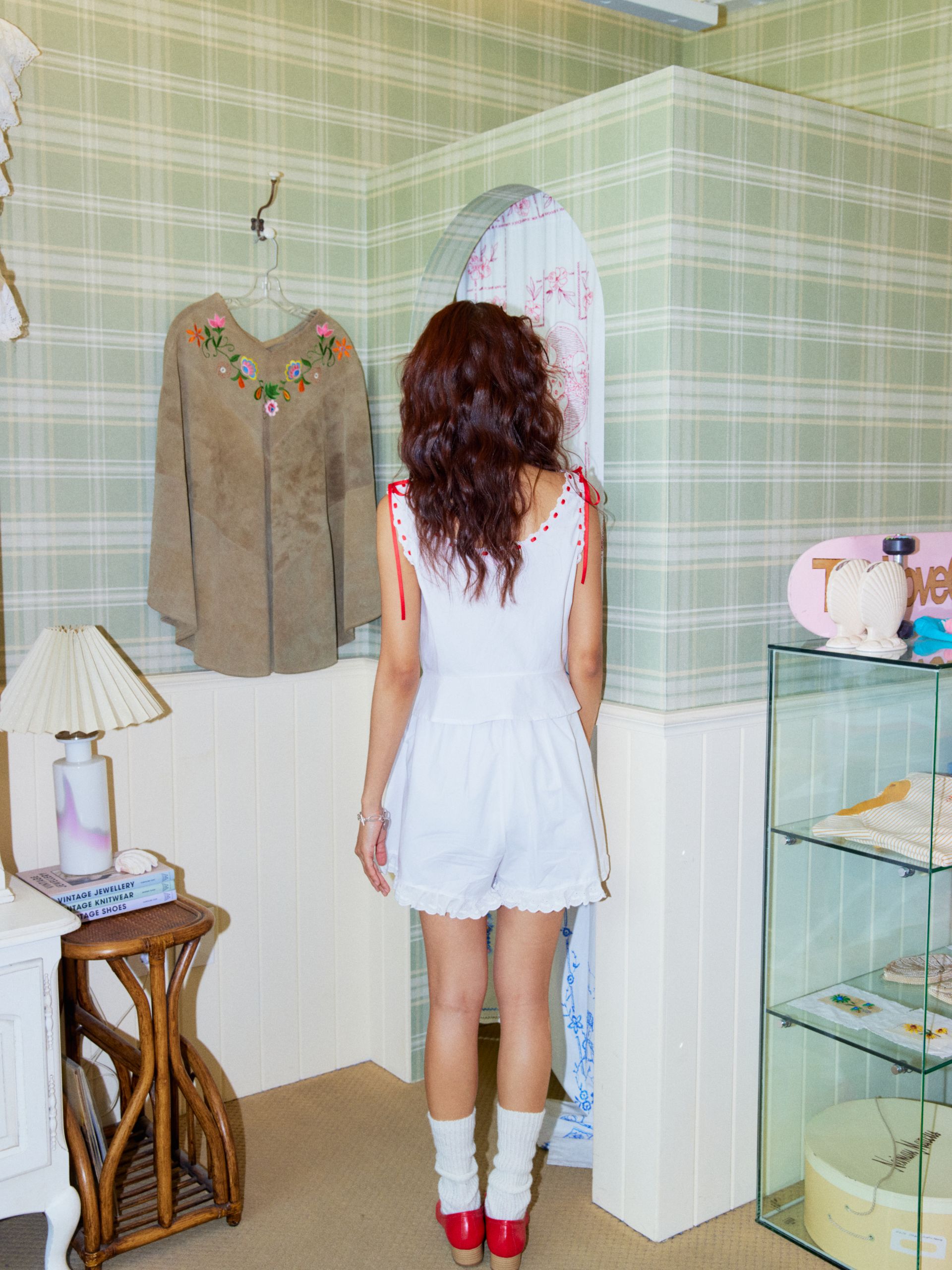 라인을 따라서 체리 자수가 들어간 레이스 러플이 포인트입니다.