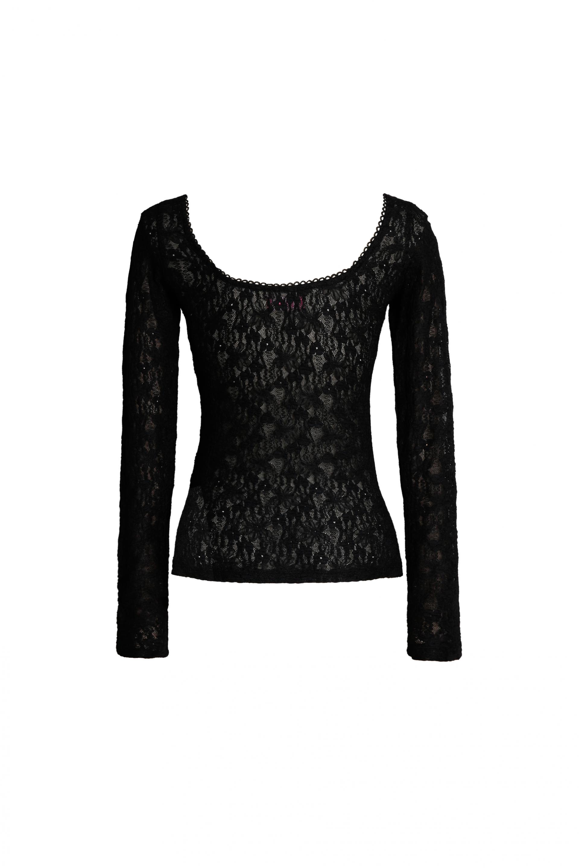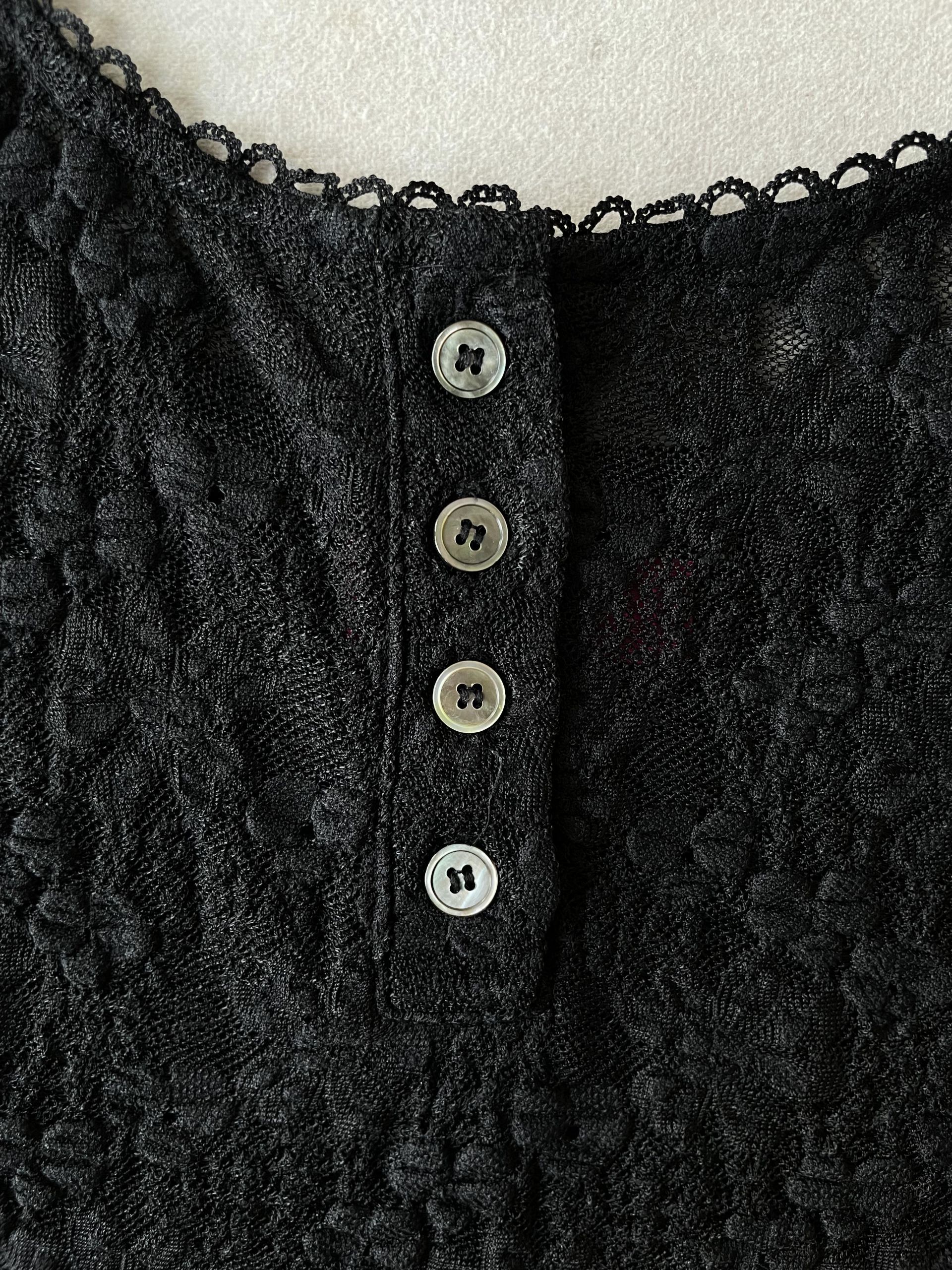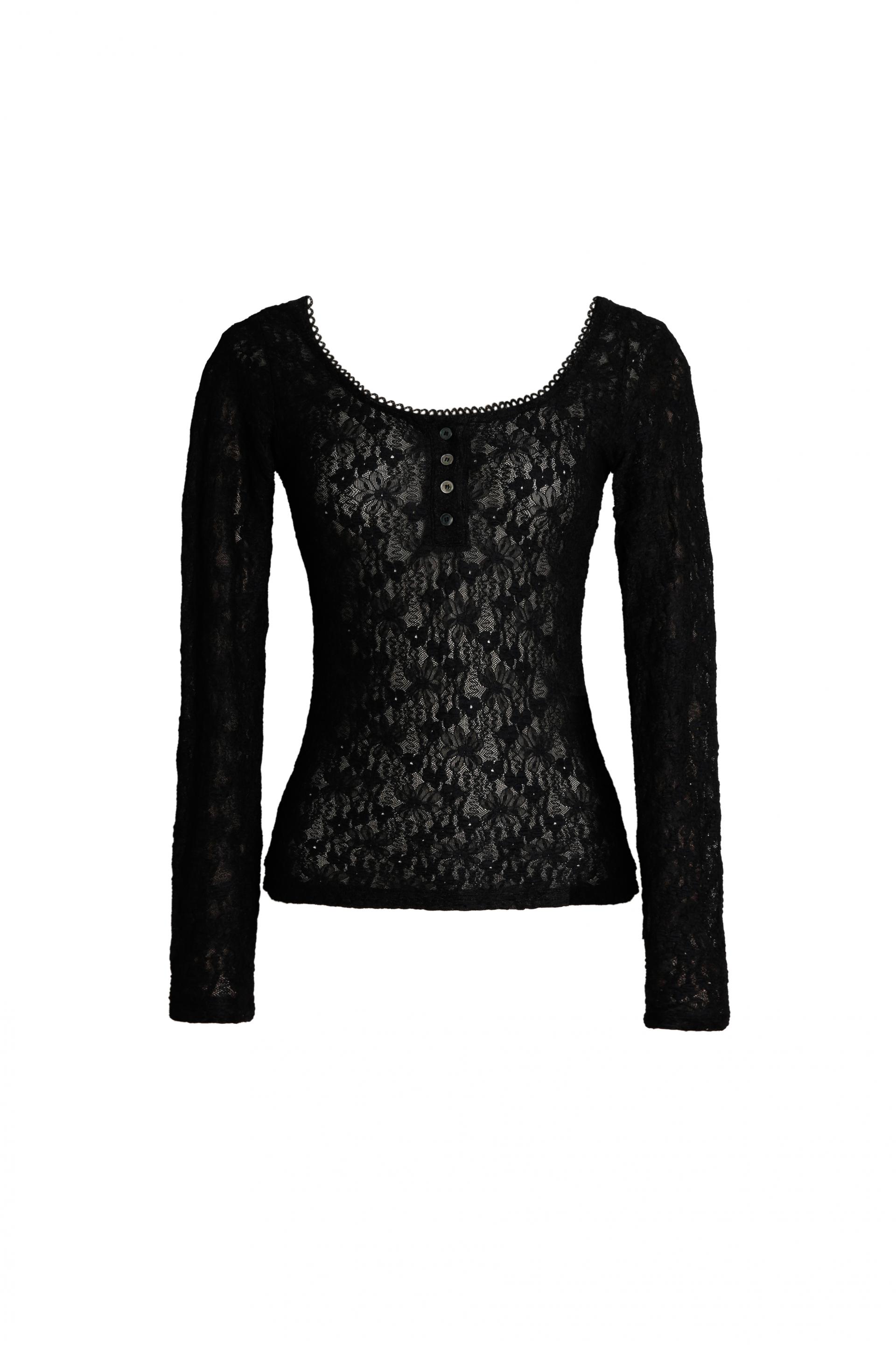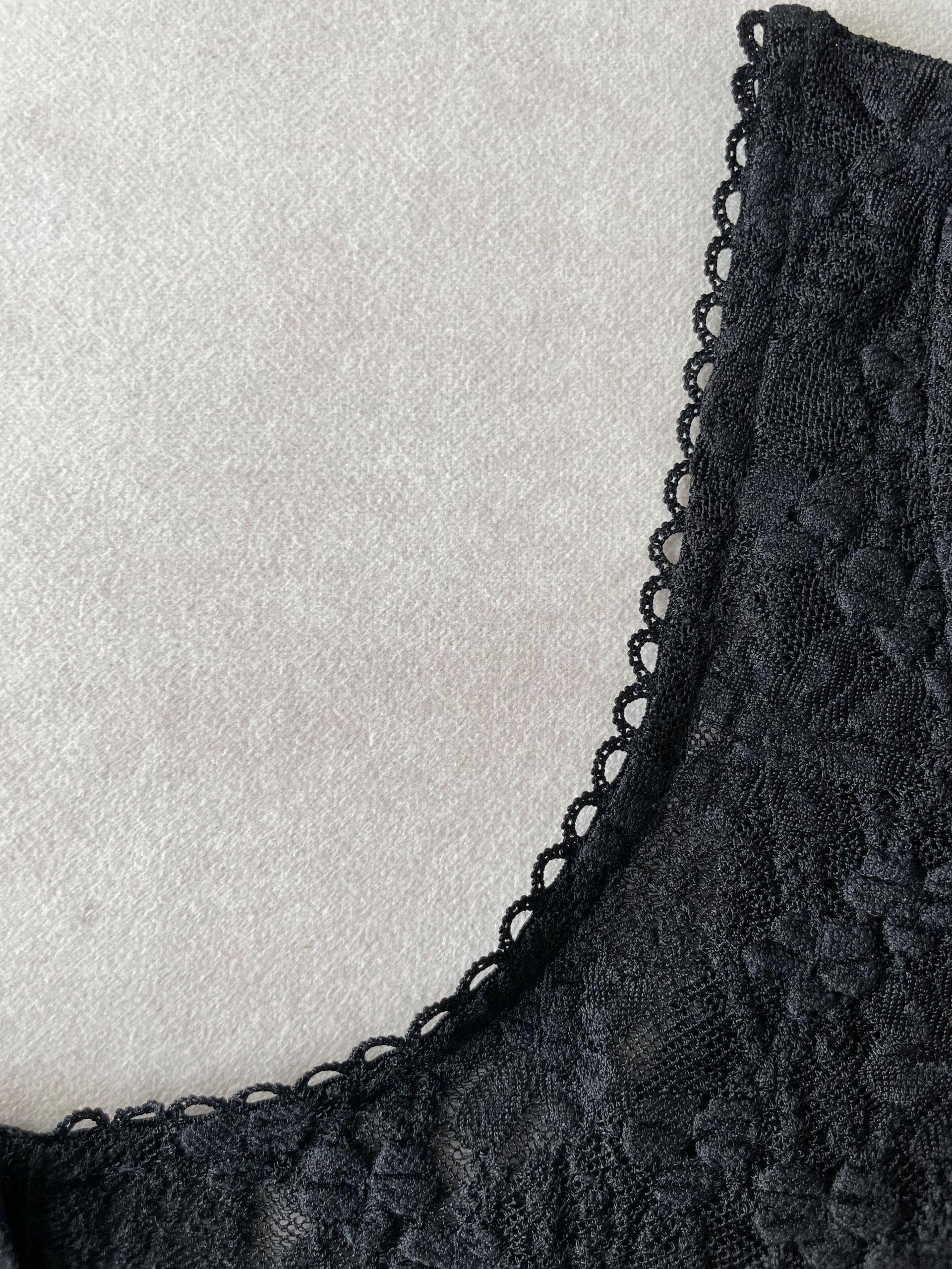 - 네크라인을 따라 달린 스캘롭 레이스 피코트 디테일